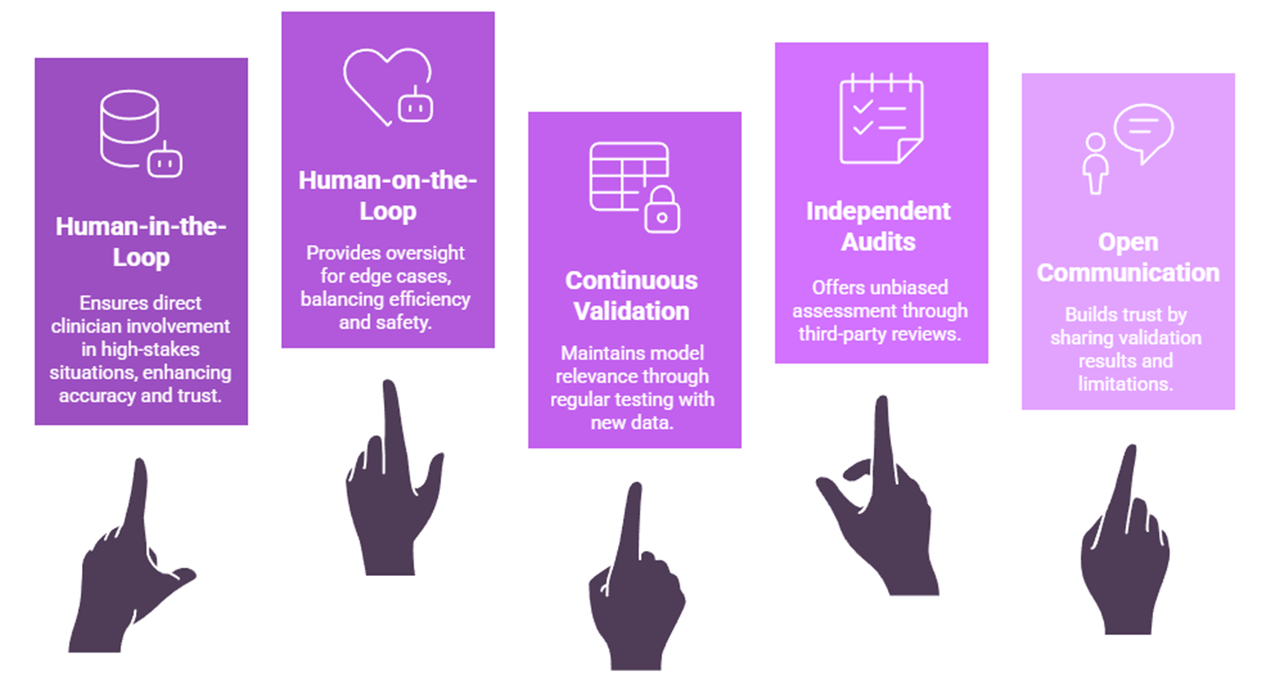 - Human-in-the-Loop (HITL) Approaches: Keeping clinicians engaged directly in reviewing all AI outputs of a particular workflow, in high-stakes situations.