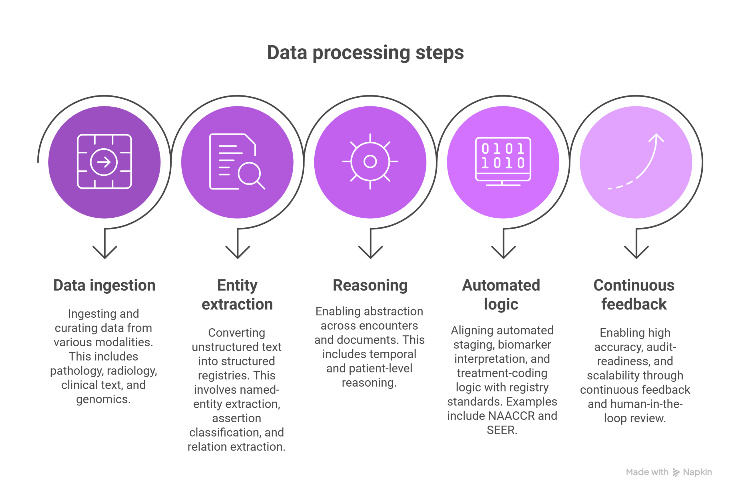 Cancer registries underpin oncology research, population health, clinical trials and value‑based care. Yet many registries remain manual, with certified tumor registrars (CTRs) reviewing pathology, radiology, clinical notes and genomics to manually abstract each case. This results in major delays, high cost and limited scalability.