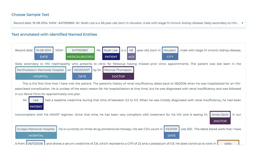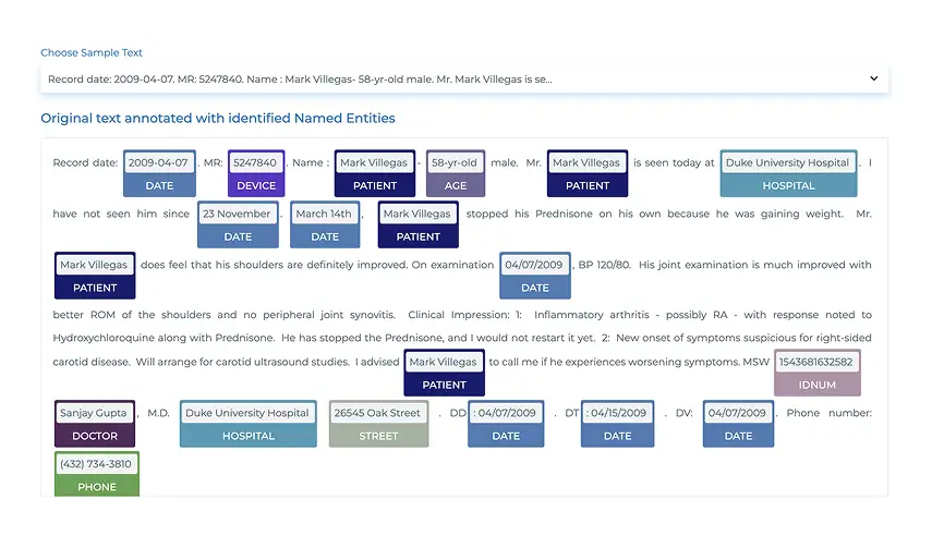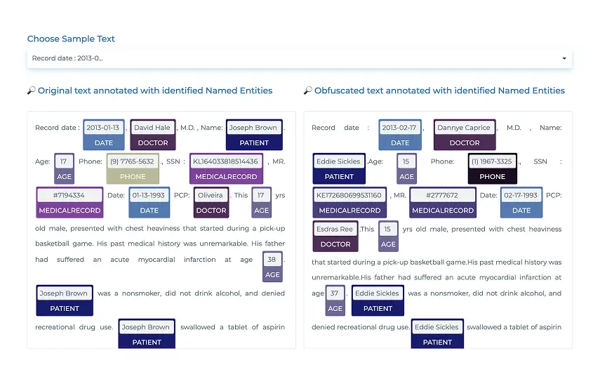 Automatically identify protected health information up to 23 entities including Patient, Doctor, Hospital, MedicalRecord, IDNum , Location, Profession etc in clinical documents using our pretrained Spark NLP models.