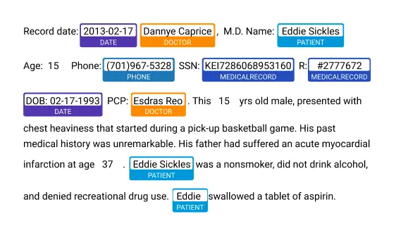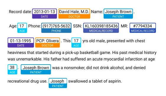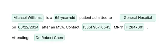 Automatically identify and obfuscate 23+ PHI entity types including patient names, doctors, hospitals, medical records, locations, dates, and contact information.