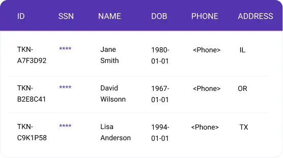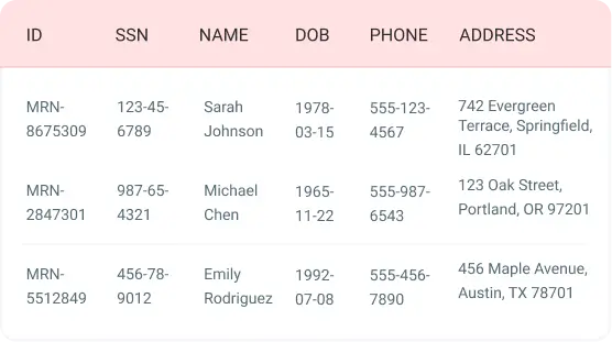 Same PHI always produces the same token. Maintains longitudinal patient linkage across records. Built for reproducible, auditable results.
