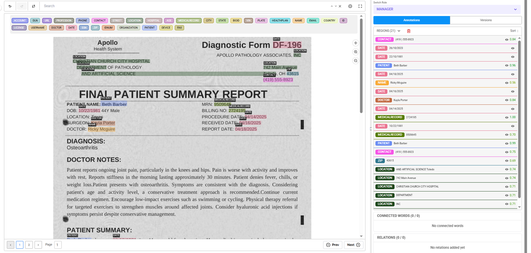 Medical AI projects routinely deal with scanned documents and images that contain sensitive patient information. Extracting insights from these visuals is crucial – but so is protecting patient privacy. Traditionally, teams had to manually redact or blur Protected Health Information (PHI) in images and PDF files, a time-consuming process prone to human error. Now, Generative AI Lab provides an integrated visual de-identification workflow that makes anonymizing medical documents seamless. This new capability allows users to import files, automatically detect and mask patient identifiers using AI, review the results with live previews, and export only the anonymized documents – all within a single platform. The result is faster, more reliable medical document de-identification that maintains compliance without disrupting your annotation workflow.