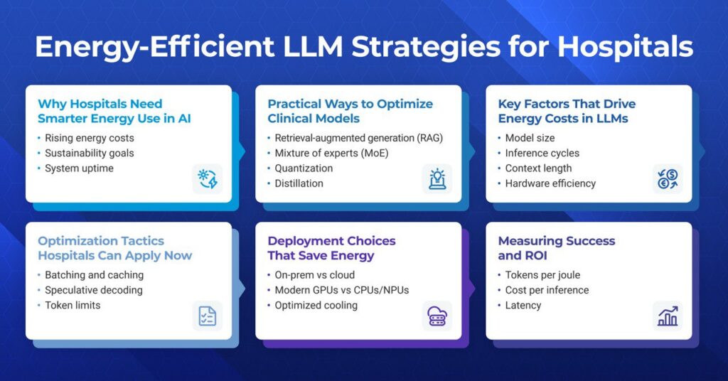 Hospitals can reduce expenses and carbon footprints by implementing energy-efficient LLM practices. They can achieve this without compromising compliance or clinical reliability.