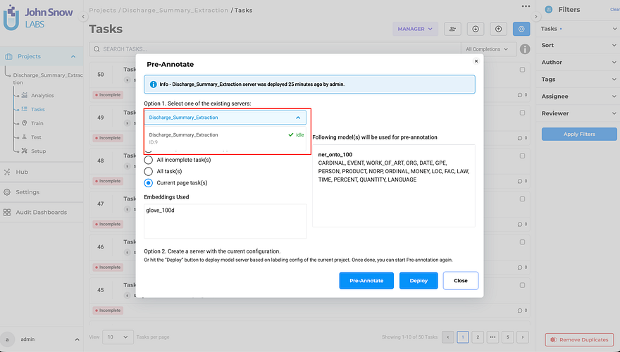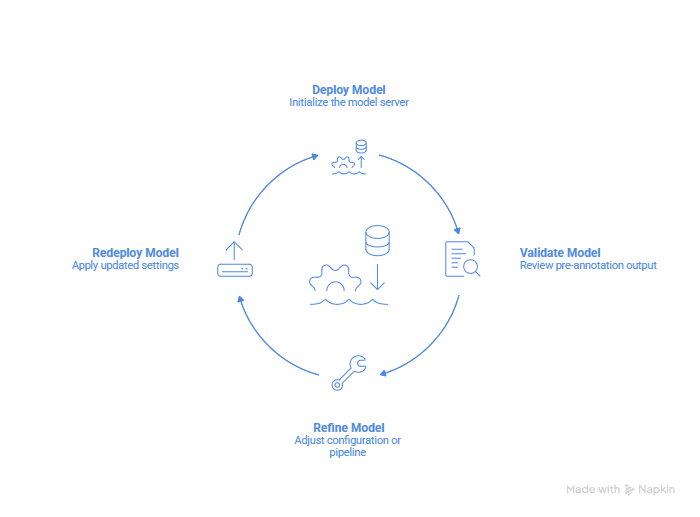 When pre-annotation deployment is triggered, the deployment modal remains open throughout server initialization, displaying real, time status updates. The interface shows what’s happening: server starting, pipeline loading, deployment progressing.