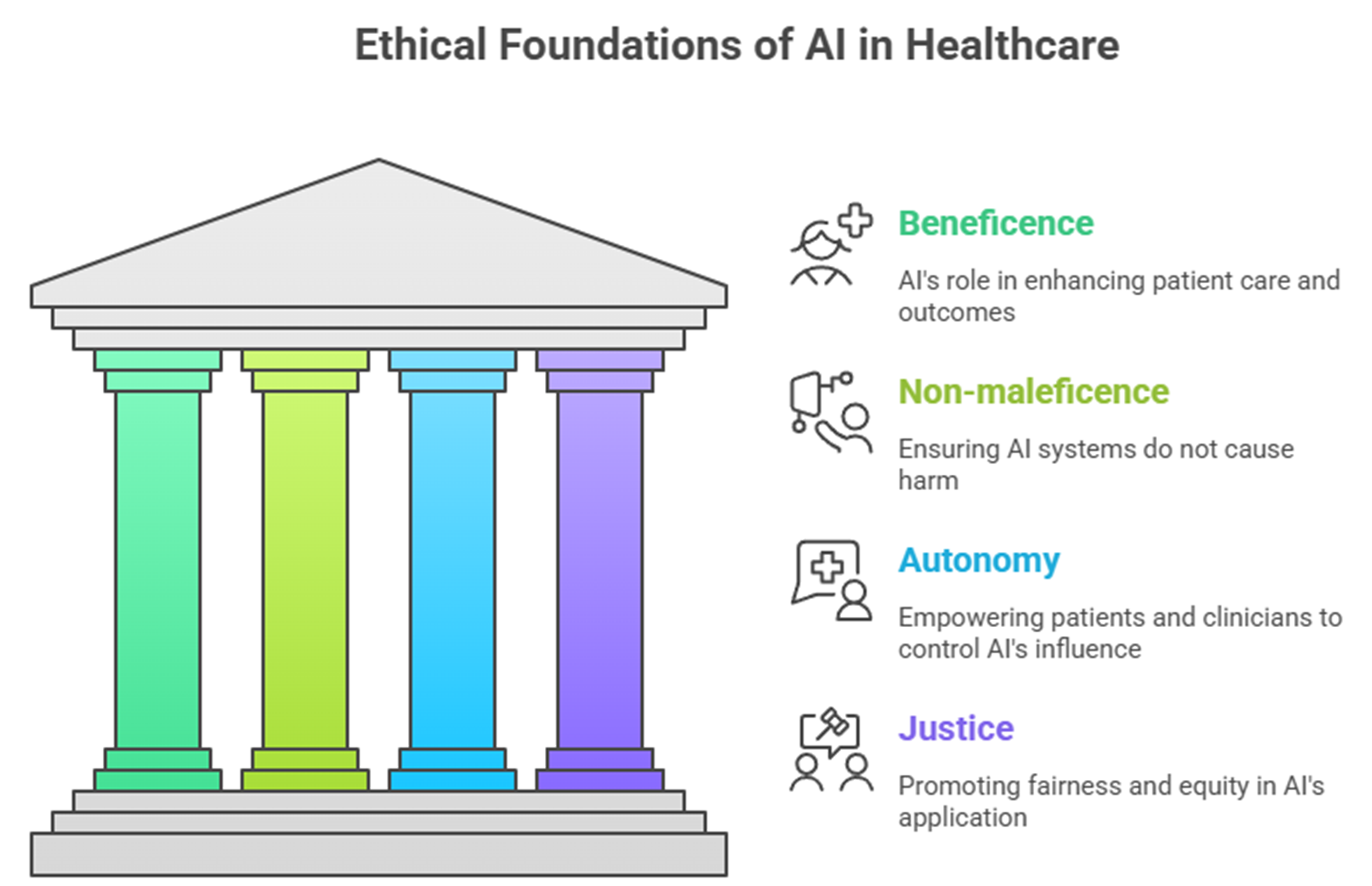 Core ethical principles from medicine beneficence, non-maleficence, autonomy, and justice apply directly to AI. Beneficence requires that AI genuinely improves patient outcomes, such as reducing documentation time or supporting accurate diagnoses. Non-maleficence means AI systems must be tested carefully to avoid harmful recommendations. Autonomy ensures that patients and clinicians both understand the role of AI in care and retain the ability to question or override its outputs. Justice demands that AI systems perform equitably across demographics, medical conditions, and healthcare settings.