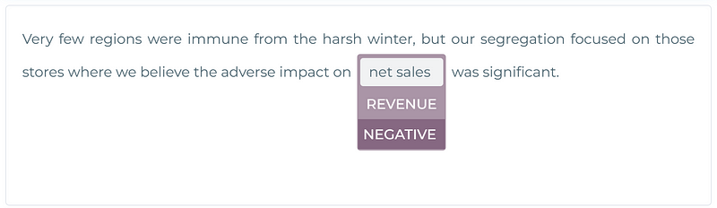 The model can identify net sales as a financial entity (REVENUE), with a NEGATIVE sentiment associated with it.