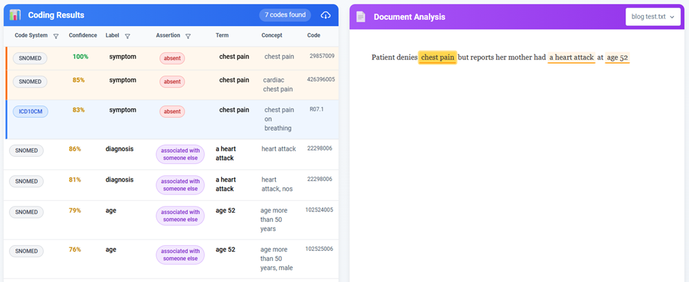 This contextual assertion layer is what separates clinical NLP from keyword matching. “No evidence of diabetes” does not get coded as a diabetes diagnosis. “Mother with breast cancer” does not appear in the patient’s own condition list. The clinical meaning is preserved throughout the pipeline.