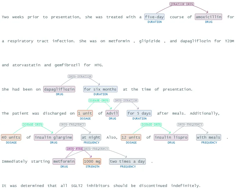The complexity of medication information often involves intricate relationships between various entities. Relation extraction models are designed to identify and map these interconnections within the text. By extracting relationships between entities, such as “DRUG” and “DOSAGE”, these models create a detailed map of the factors about medication information. This relational data is invaluable for uncovering hidden patterns and correlations that are critical for further studies.
