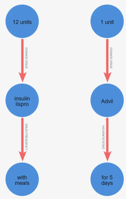 The zoomed view highlights how Neo4j helps validate the model output at a granular level: you can quickly inspect whether a specific attribute (e.g., “12 units” or “1 unit”) is attached to the correct drug and whether the relationship type matches the expected clinical meaning. This is especially useful, because graph visualization often reveals missing links or misattached attributes faster than scanning rows in a table.