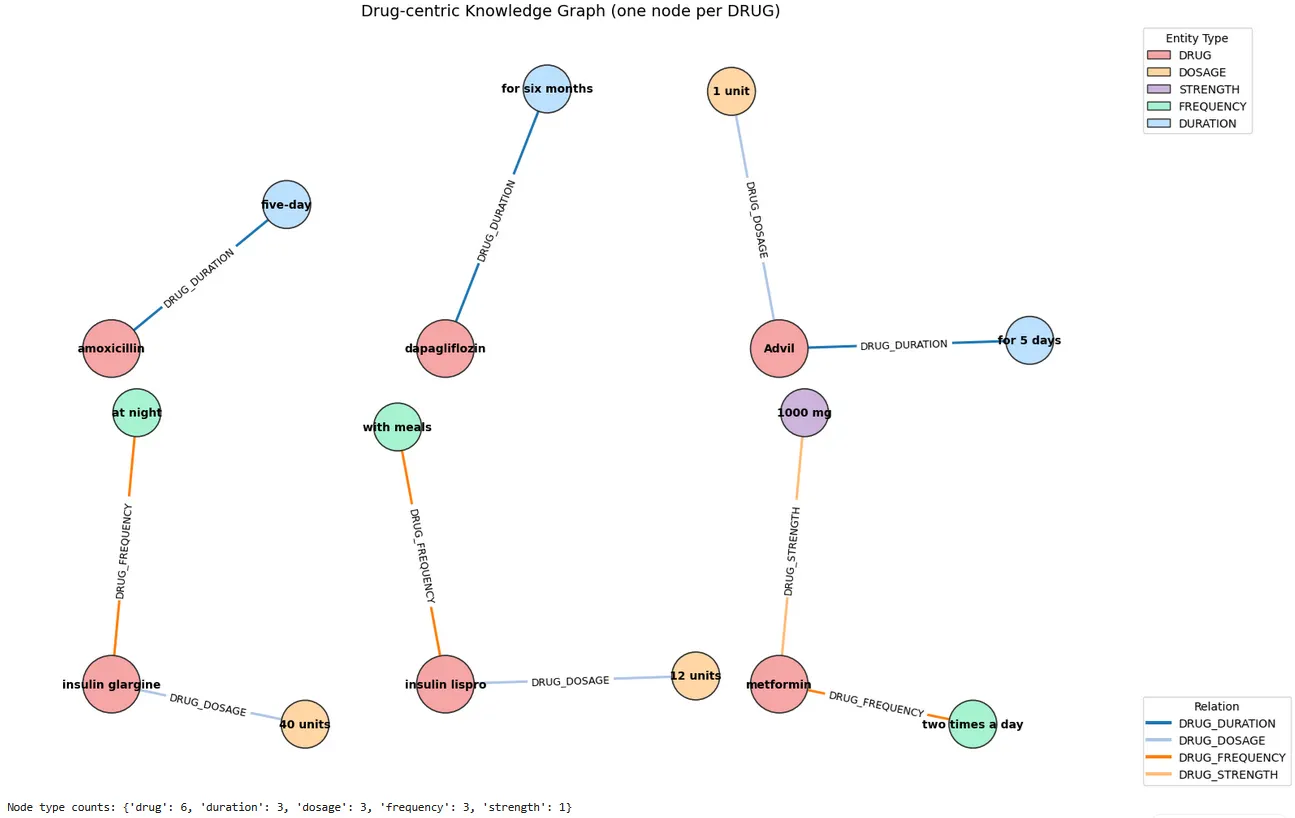 In the NetworkX graph, we use a drug-centric design, where each DRUG node acts as a hub and connects outward to its associated regimen attributes — DOSAGE, STRENGTH, FREQUENCY, and DURATION. This representation mirrors how clinicians think about prescriptions: a medication is meaningful only when its dose, timing, duration, and strength are attached to it. As shown in the figure, the graph separates medication “clusters” cleanly (e.g., amoxicillin → five-day, dapagliflozin → for six months, insulin glargine → 40 units → at night), making it easy to validate whether the extracted relationships are coherent at a glance.