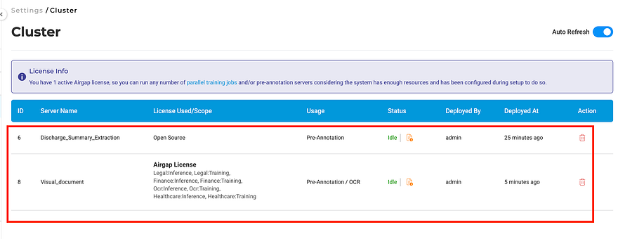 The Cluster page lists all deployed pre-annotation servers.