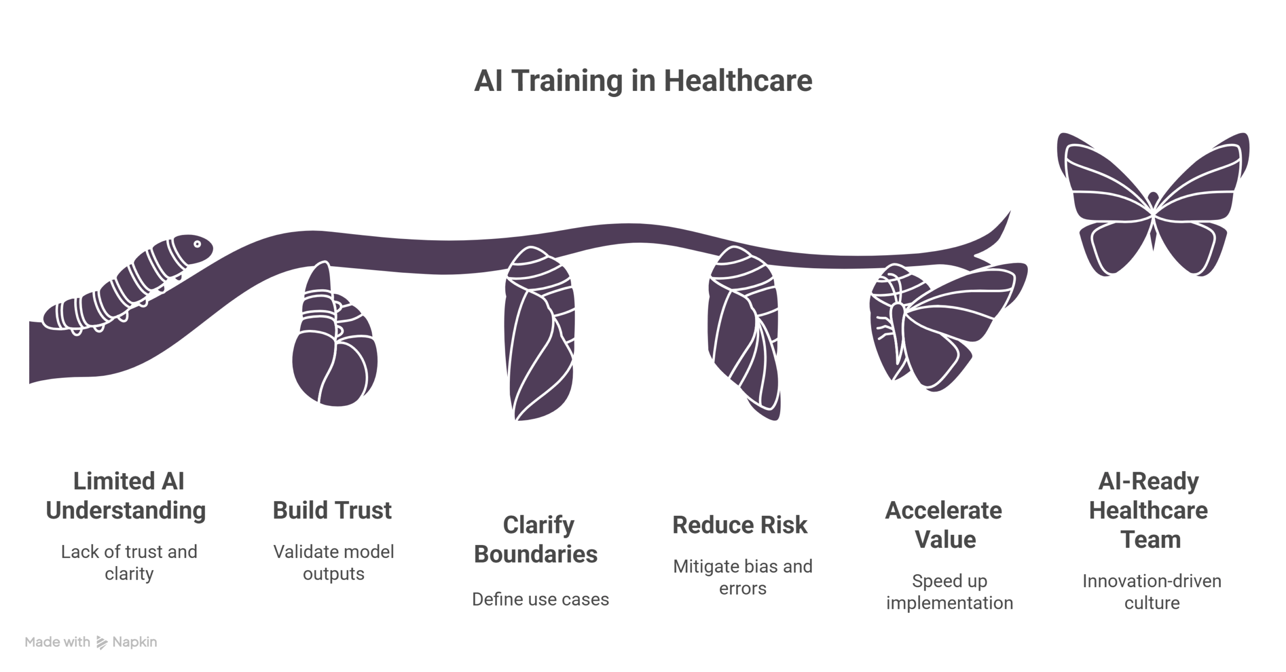Training ensures safe, ethical, and effective use of AI across clinical and operational settings. Without it, even the most accurate model or streamlined workflow may be met with mistrust or misapplication.