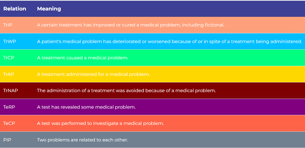In the above figure, we see various relations between entities. For instance, “respiratory tract infection” is a PROBLEM and “amoxicillin” is a TREATMENT that cures this medical problem. These entities are related to each other via TrAP relation.