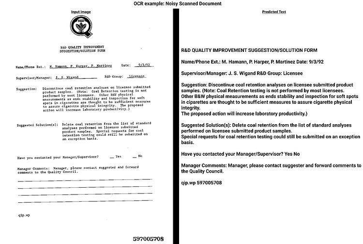 Sample noisy document scan and OCR prediction