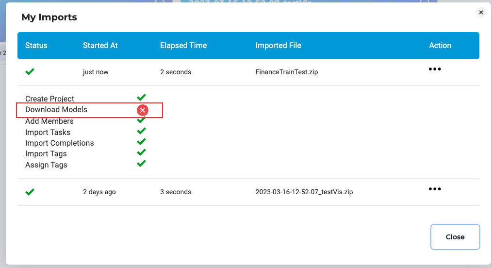 When a user imports a project in NLP Lab 4.8, the system automatically downloads any absent models utilized by the imported project. To enable users to check whether the models have been downloaded or not, a new section named “Download Models” has been included in the Import status. If the required models have been downloaded or are already present, a green tick will be displayed. On the other hand, if the download process is unsuccessful, a red cross will be shown.