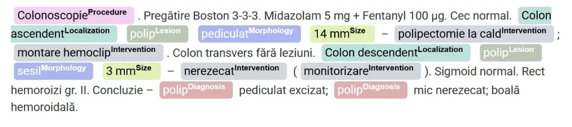 Artificial intelligence (AI) can be applied in the practice of gastroenterology to acquire and analyze information. Besides speed and duplicability, AI has the potential of also offering insight with results that surpass medical specialists. Natural language processing (NLP) is being used to extract information from text, organize and categorize documents. Processing unstructured data with NLP will result in structured data and medical codes can be extracted more easily (ICD10, medical procedure codes, etc) for reimbursement purposes among others. Recent research is studying the use of AI for automated interpretation of text from endoscopy and medical documents for better quality and patient phenotyping as well as enhanced detection and descriptions of endoscopic lesions such as colon polyps. In this paper, we present a method of extracting medical data using Spark NLP (John Snow Labs, DE, USA), by annotating endoscopy reports and training a model to automatically extract labels in order to obtain