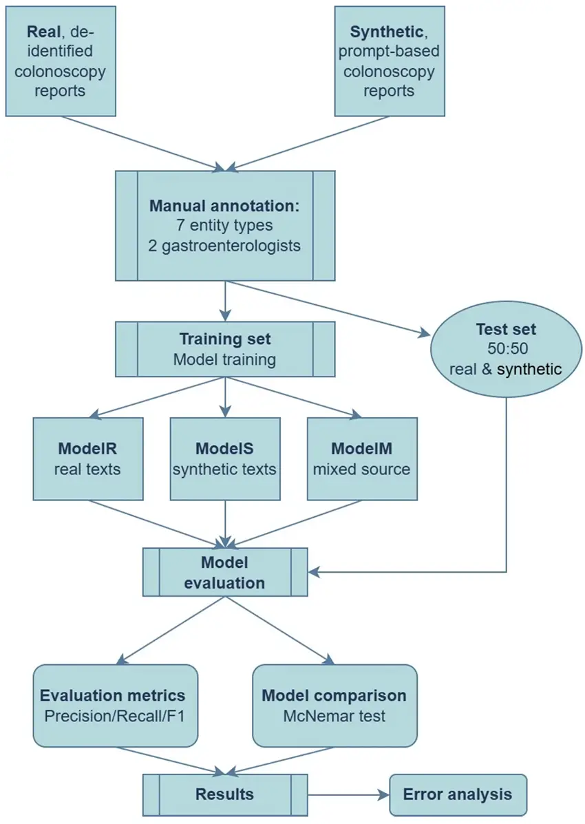 Micro-averaged precision, recall, and F1-score values were computed; McNemar tests with Bonferroni correction assessed pairwise differences. Results: ModelM outperformed single-source models (precision 0.95, recall 0.93, F1 0.94) and was significantly superior to ModelR (F1 0.70) and ModelS (F1 0.64; p < 0.001 for both). ModelR maintained high accuracy on real text (F1 = 0.90), but its accuracy fell when tested on synthetic data (0.47); the reverse was observed for ModelS (F1 = 0.99 synthetic, 0.33 real). McNemar χ2 statistics (64.6 for ModelM vs. ModelR; 147.0 for ModelM vs. ModelS) greatly exceeded the Bonferroni-adjusted significance threshold (α = 0.0167), confirming that the observed performance gains were unlikely to be due to chance. Conclusions: Synthetic colonoscopy descriptions are a valuable complement, but not a substitute for real annotations, while AI is helping human experts, not replacing them. Training on a balanced mix of real and synthetic data can help to obtain robust, generalizable NER models able to structure free-text colonoscopy reports, supporting large-scale, privacy-preserving colorectal cancer surveillance and personalized follow-up.