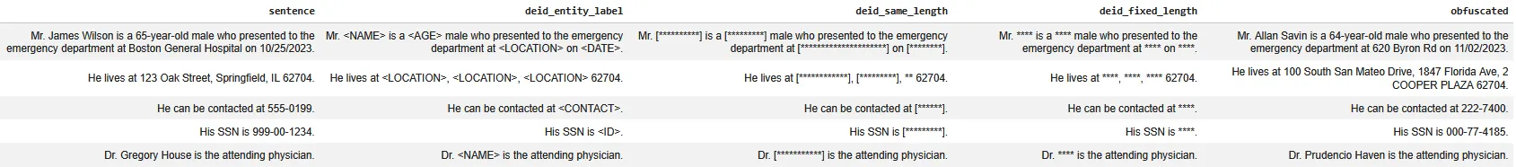 The dataframe below show the same input text processed through these different strategies. You’ll notice that the underlying PHI detection stays consistent, but the final output changes depending on whether you want maximally explicit redaction (entity labels), format-preserving masking (same-length / fixed-length), or readable privacy-safe text (obfuscation). This makes it easy to choose the right output style based on whether your next step is manual review, dataset sharing, annotation, or downstream modeling.