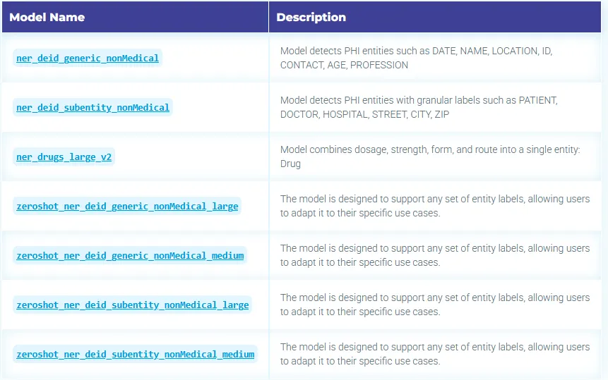 Overall, these seven new NER models add practical building blocks for end-to-end clinical text workflows. The de-identification models help you detect PHI at either a broad level (generic labels) or with more granularity (sub-entity labels), while the zero-shot variants provide a flexible path when your labeling needs or document styles vary.