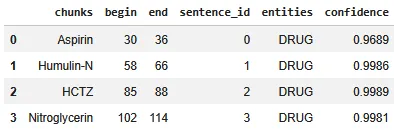 The results include a structured table of extracted spans (chunk text, character offsets, sentence id, predicted label, and confidence). In the example shown below, the model correctly identifies medication mentions such as Aspirin, Humulin N, HCTZ, and Nitroglycerin, labeling them consistently as DRUG.
