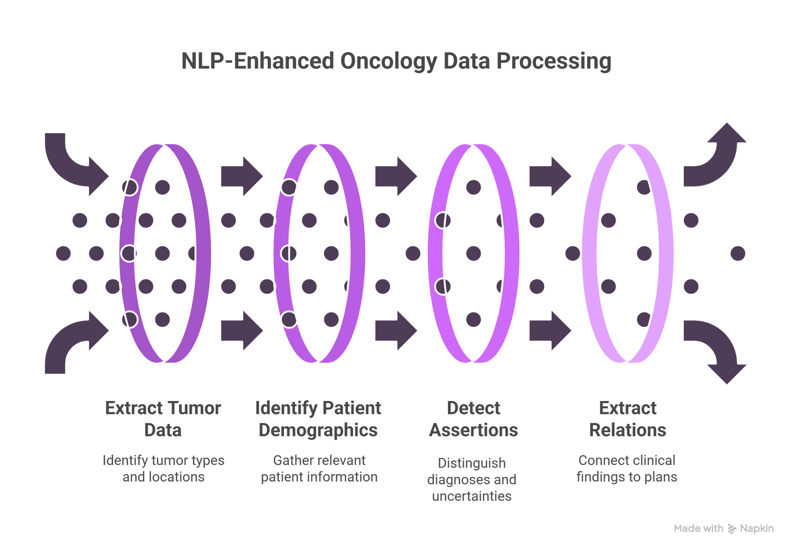In oncology, valuable clinical information is often locked in free-text notes. Language models such as Named Entity Recognition (NER) and assertion detection allow systems to automatically identify and verify key elements in these texts.
