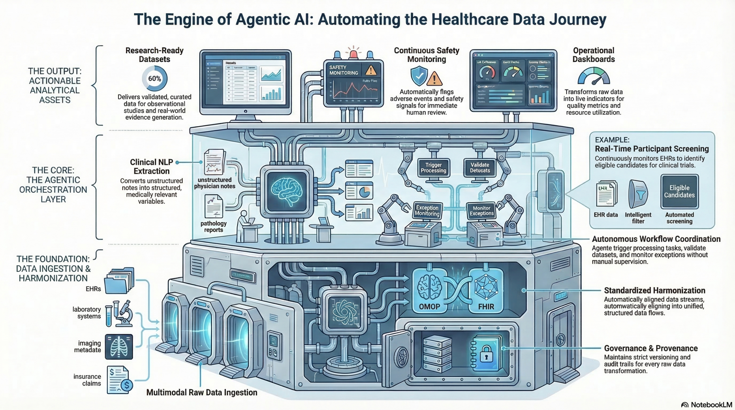 Agentic AI provides a powerful solution by coordinating the complex workflows required to transform raw healthcare data into research datasets, safety monitoring systems, and operational analytics.