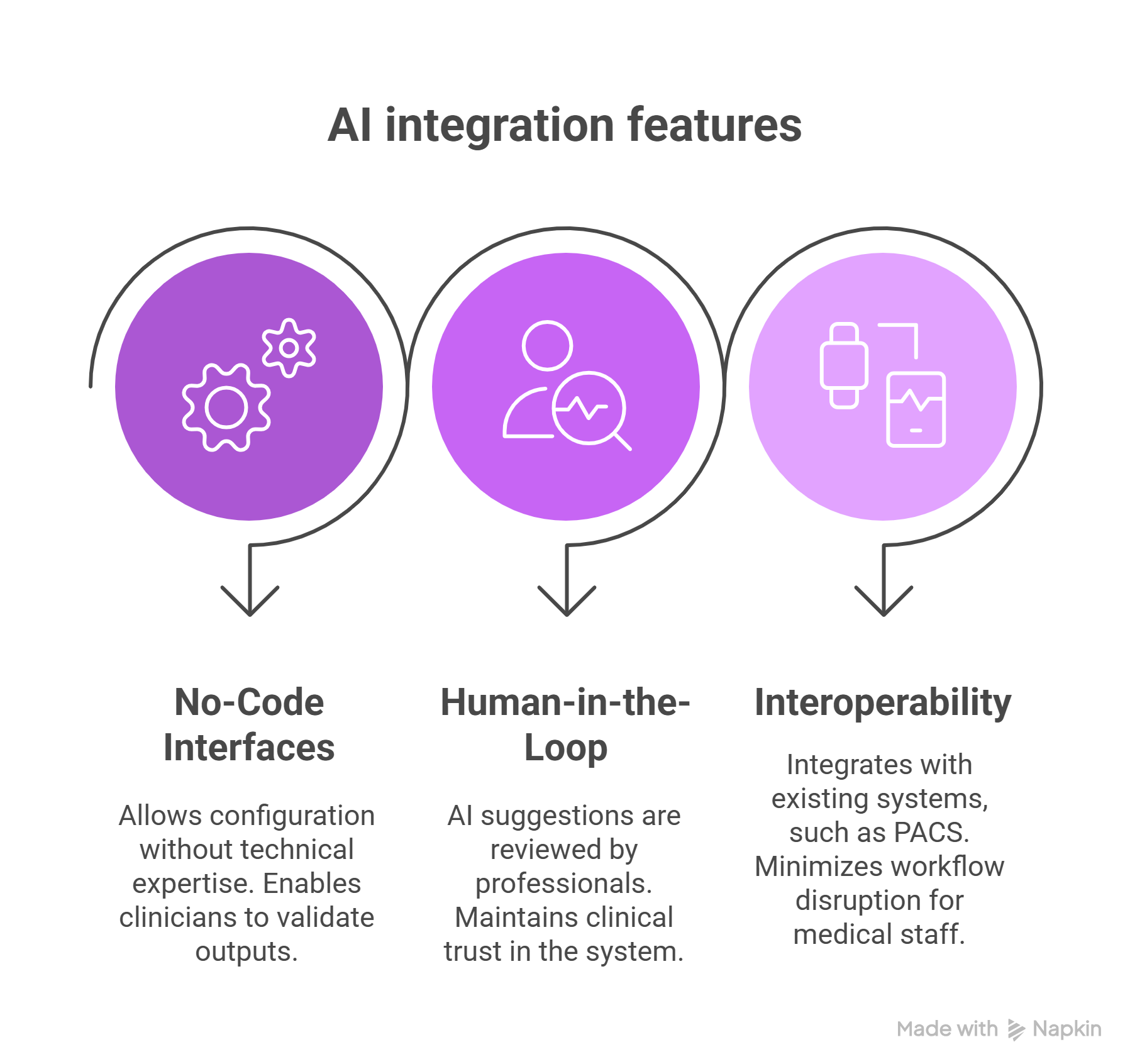 - No-Code/Low-Code Interfaces: Clinicians and medical operations teams can configure workflows and validate outputs without needing deep technical skills.