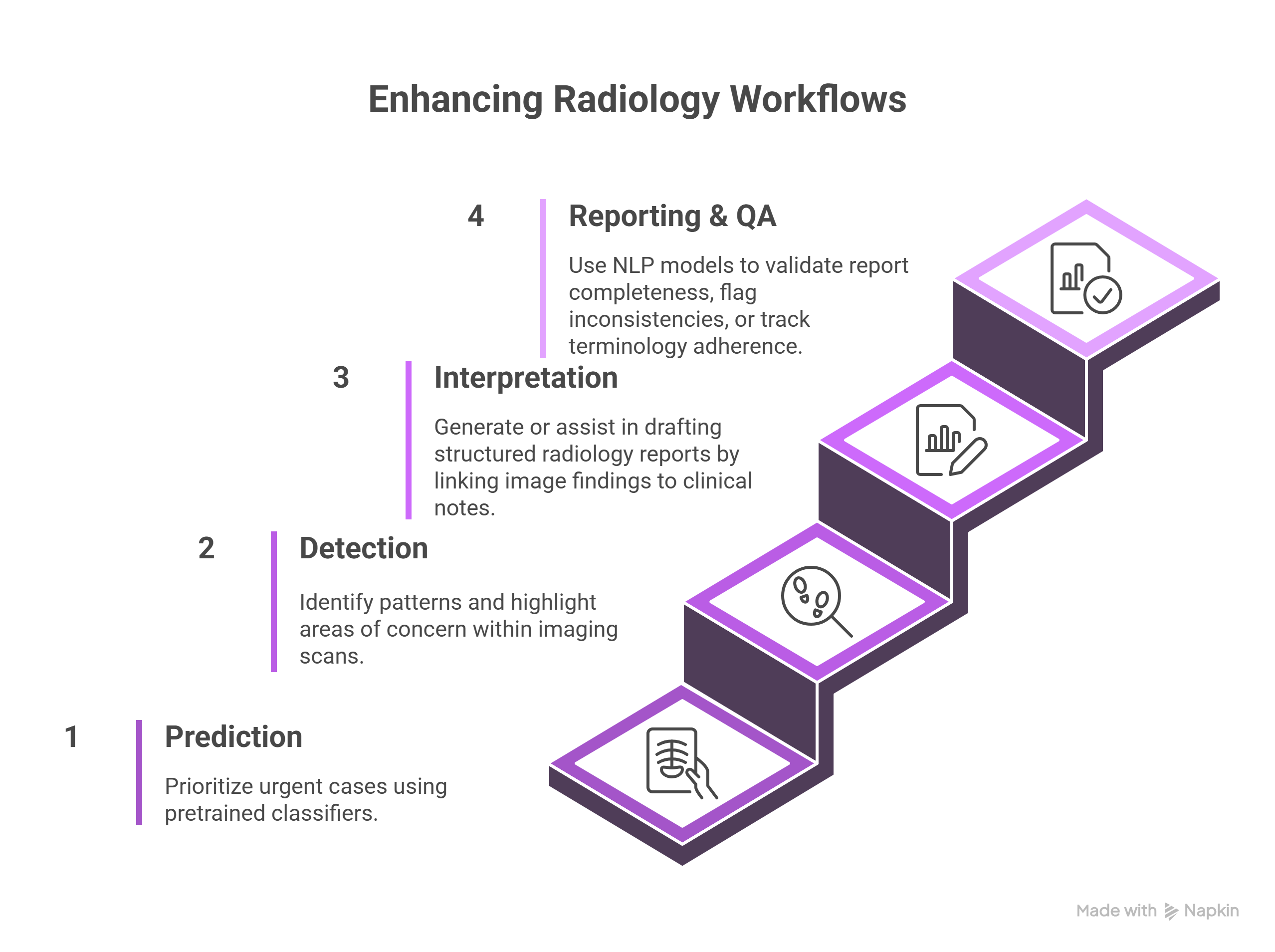 - Interpretation (Contextual Analysis): Generate or assist in drafting structured radiology reports by linking image findings to clinical notes.