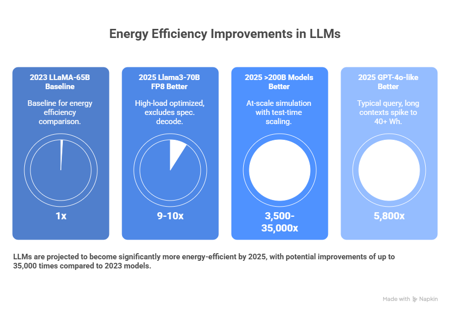 | 2025 (Epoch AI) | GPT-4o-like / H100 | ~0.6 mJ/output (est.) | ~5,800× better | Typical query; long contexts spike to 40+ Wh. |