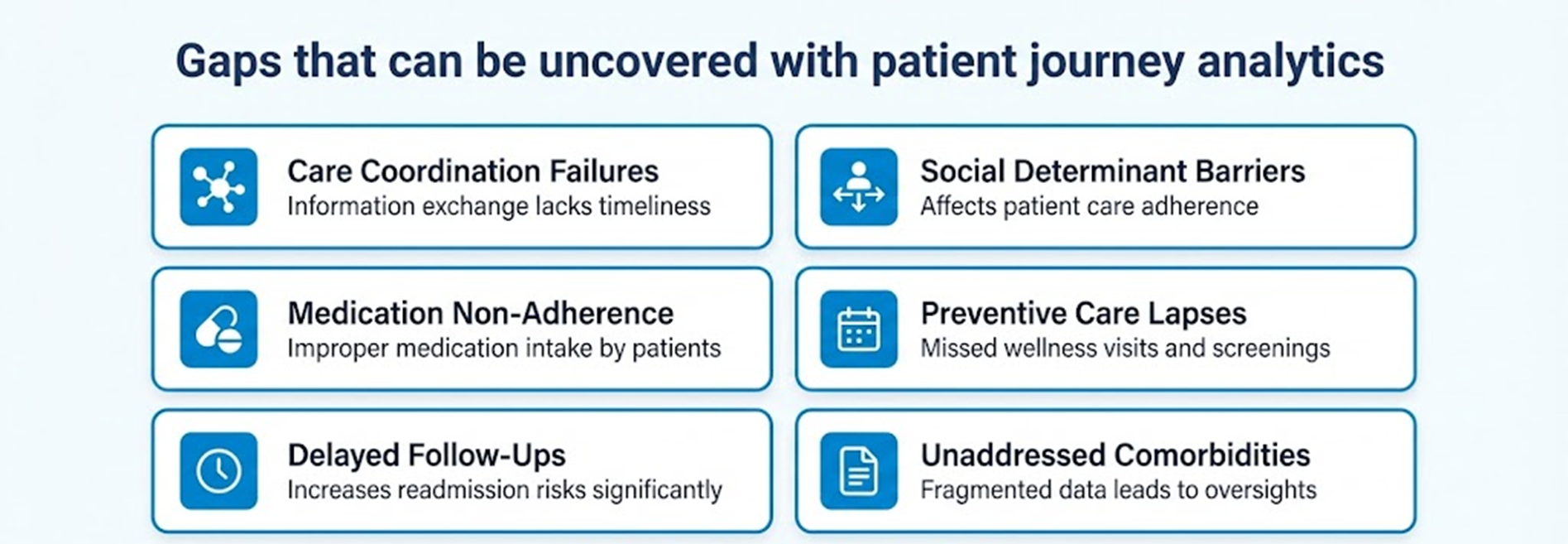 AI and advanced NLP models help healthcare providers detect patterns and barriers that are often invisible in siloed systems. Commonly identified care gaps include: