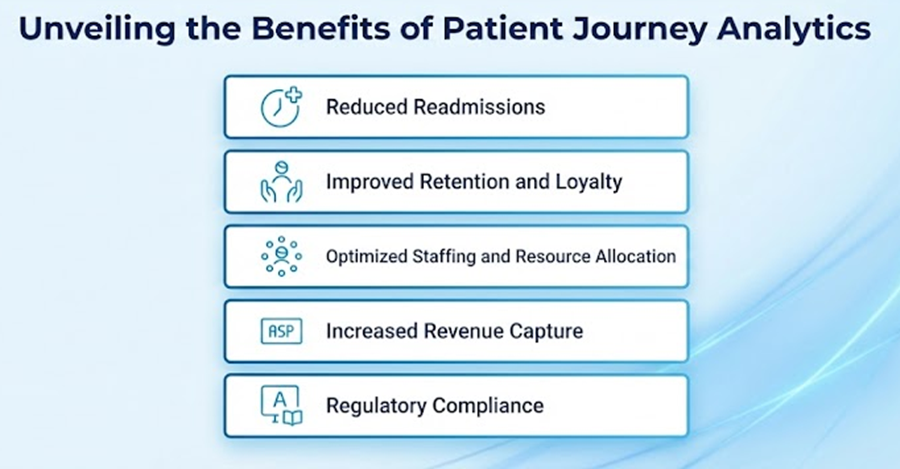 Return on investment (ROI) in journey analytics reflects both clinical and financial outcomes. Key metrics include: