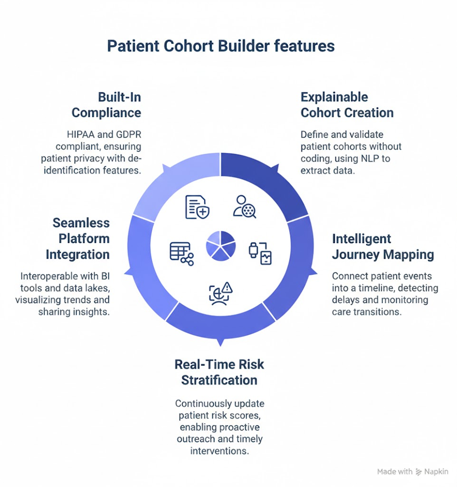 It offers explainable AI, healthcare-specific NLP, and privacy-preserving pipelines, allowing non-technical users to create, validate, and act on patient cohorts securely.